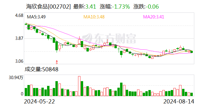 截至发稿,海欣食品市值为19亿元。